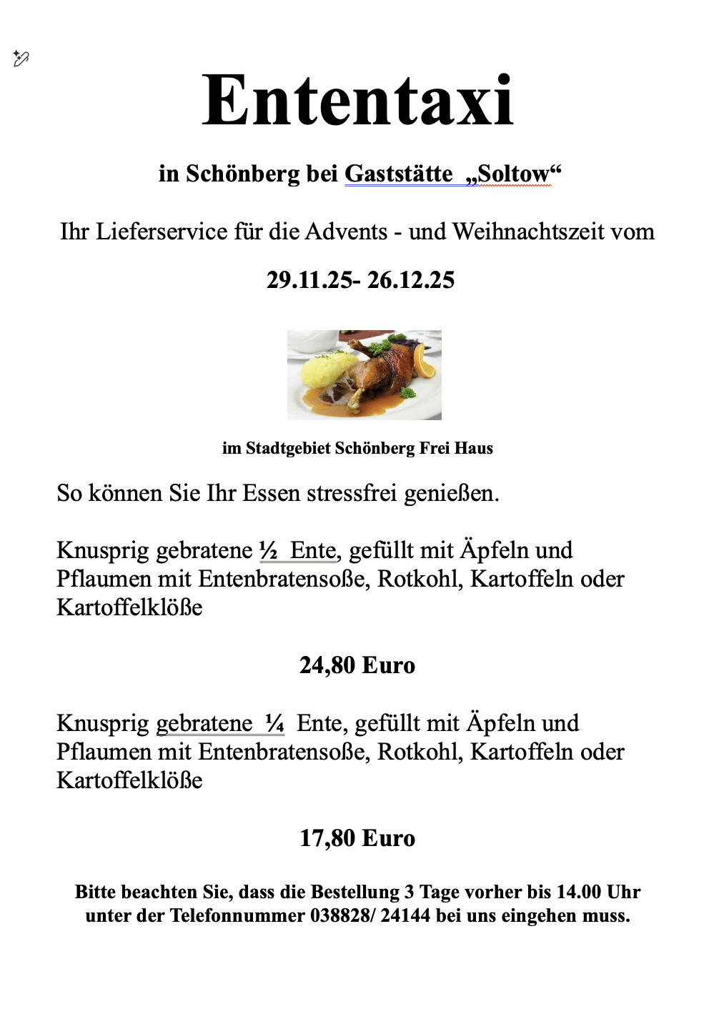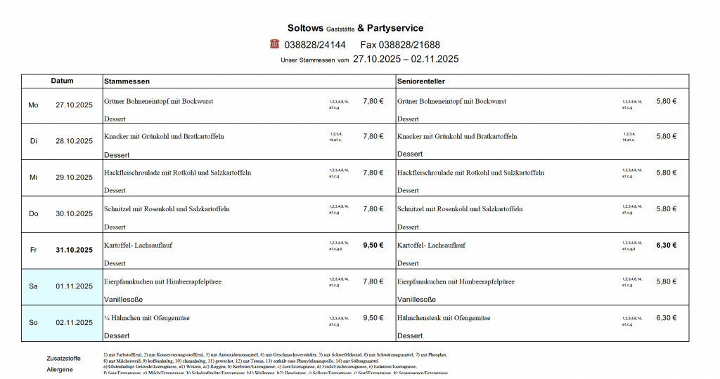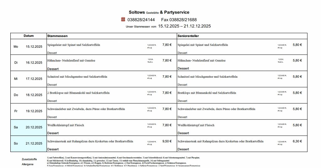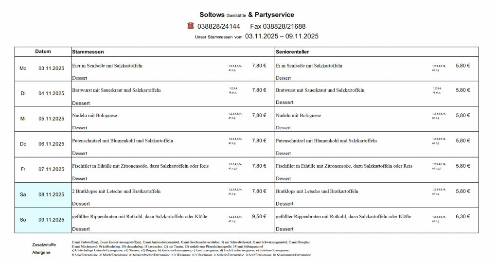 …auf der Internetseite der Gaststätte Soltows. Wir laden Sie herzlich ein, sich von unserer deutschen Küche in gemütlicher Atmosphäre verwöhnen zu lassen. Bei uns bekommen Sie gutbürgerliche deutsche Küche, täglich wechselnden Mittagstisch und Spezialitäten passend zu jeder Jahreszeit. Wir richten zudem gern Ihre Feier aus und beliefern Sie frei Haus.