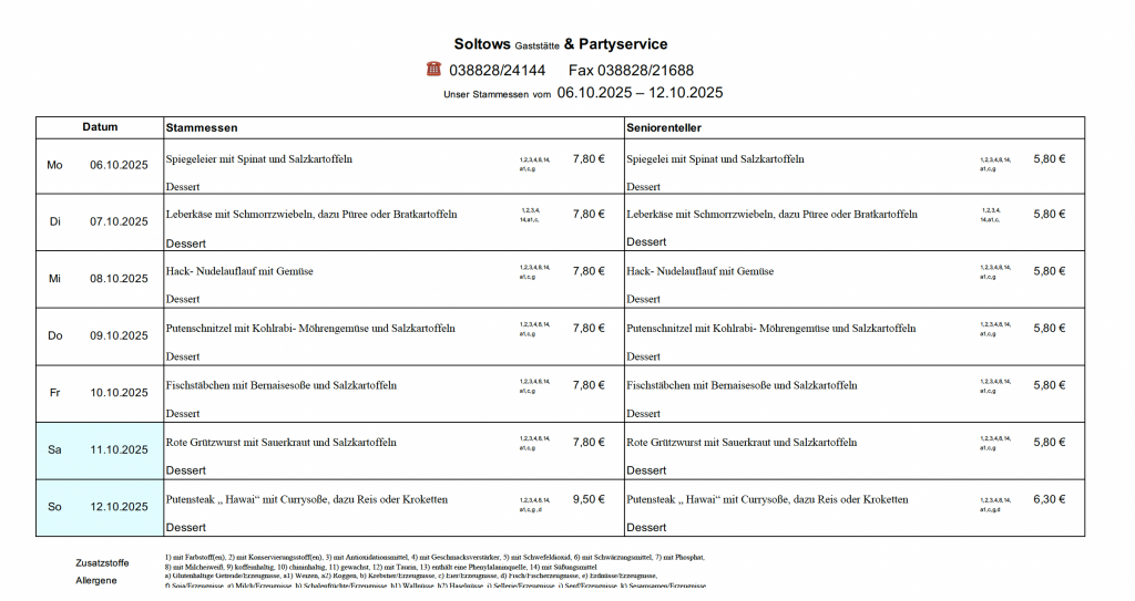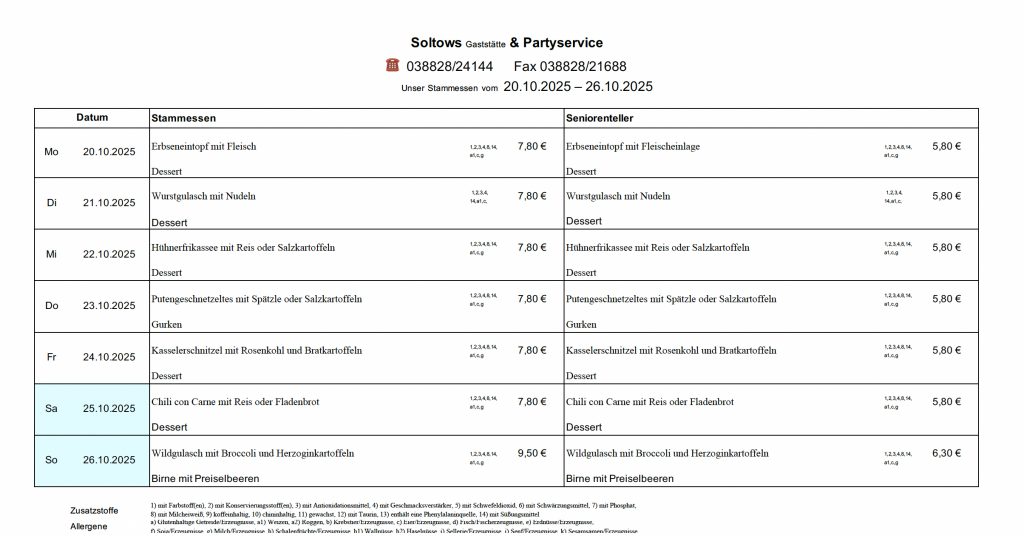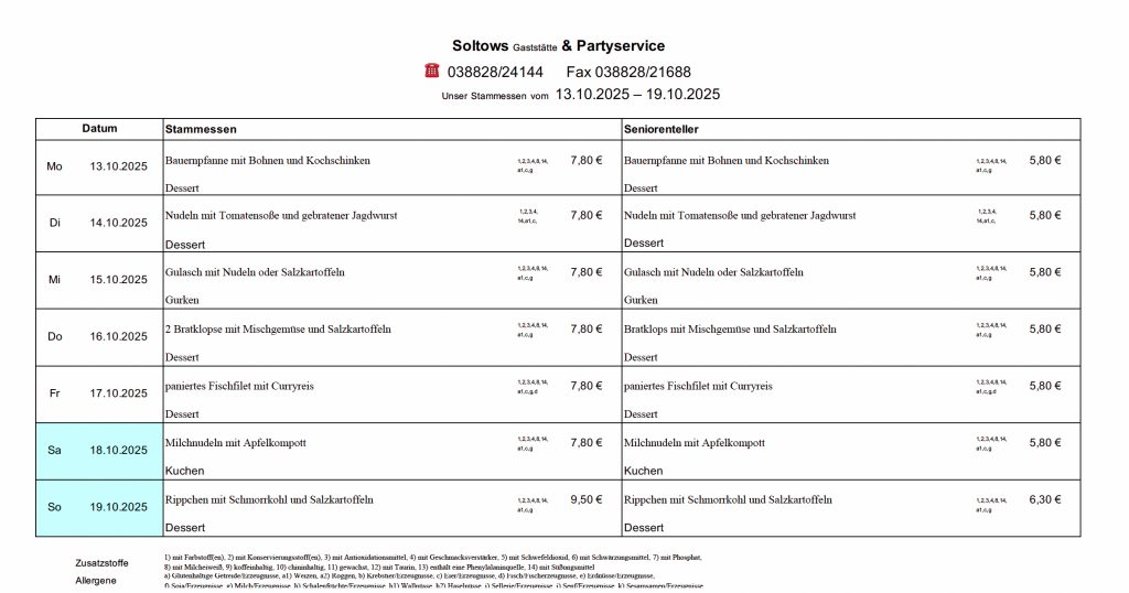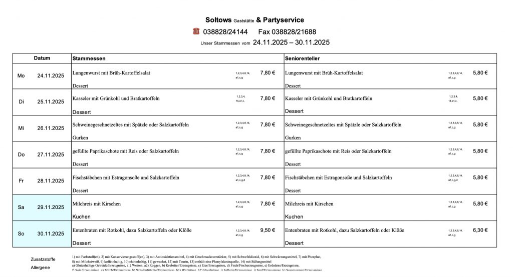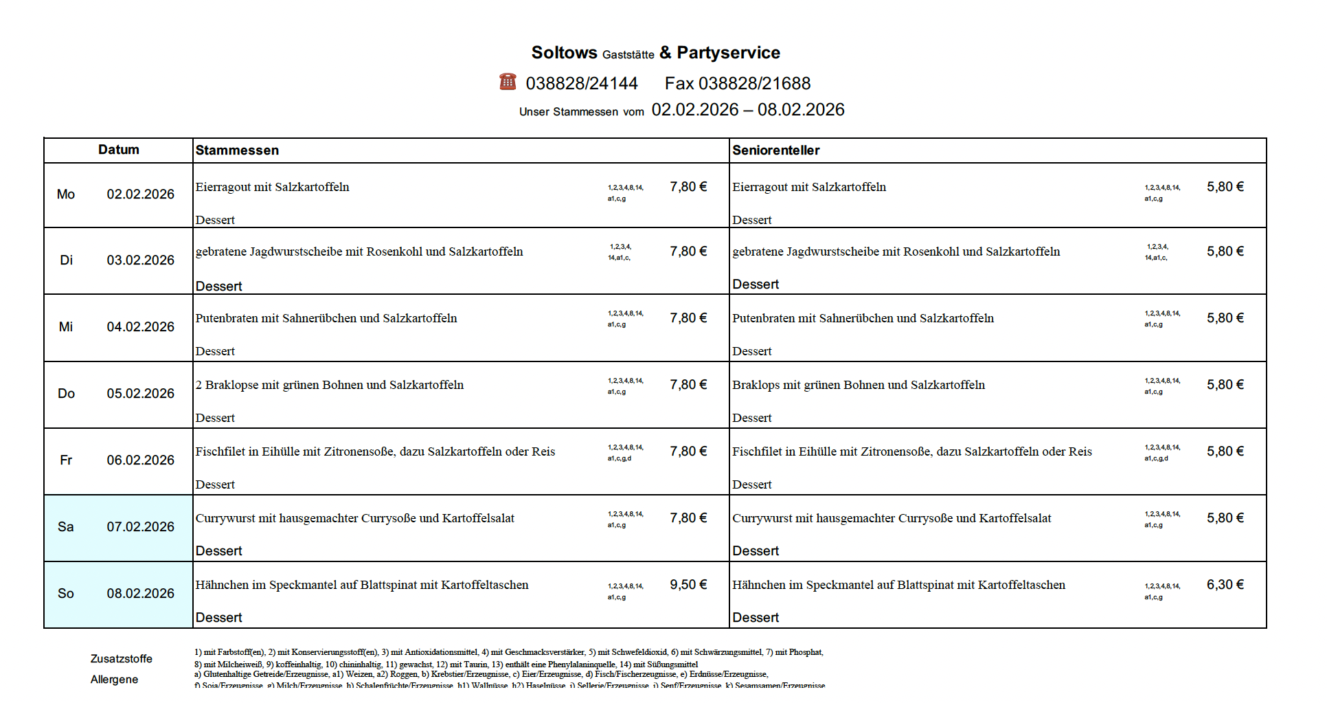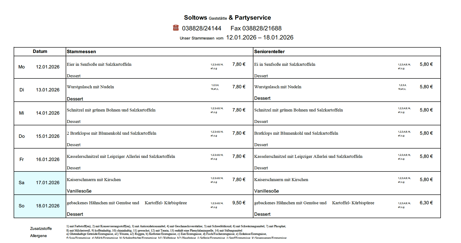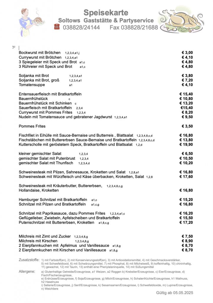 …auf der Internetseite der Gaststätte Soltows. Wir laden Sie herzlich ein, sich von unserer deutschen Küche in gemütlicher Atmosphäre verwöhnen zu lassen. Bei uns bekommen Sie gutbürgerliche deutsche Küche, täglich wechselnden Mittagstisch und Spezialitäten passend zu jeder Jahreszeit. Wir richten zudem gern Ihre Feier aus und beliefern Sie frei Haus.
